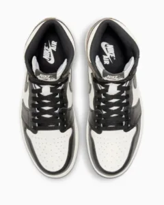 El par se compone principalmente de paneles negros sobre una parte superior de cuero blanco de calidad premium. Acentos de ante marrón en la parte posterior del zapato añaden un toque de elegancia. La marca clásica de Jordan está presente con el distintivo Swoosh negro y el logo Jordan Wings. El conjunto se completa con una suela exterior negra que resalta los detalles finos de la creación.